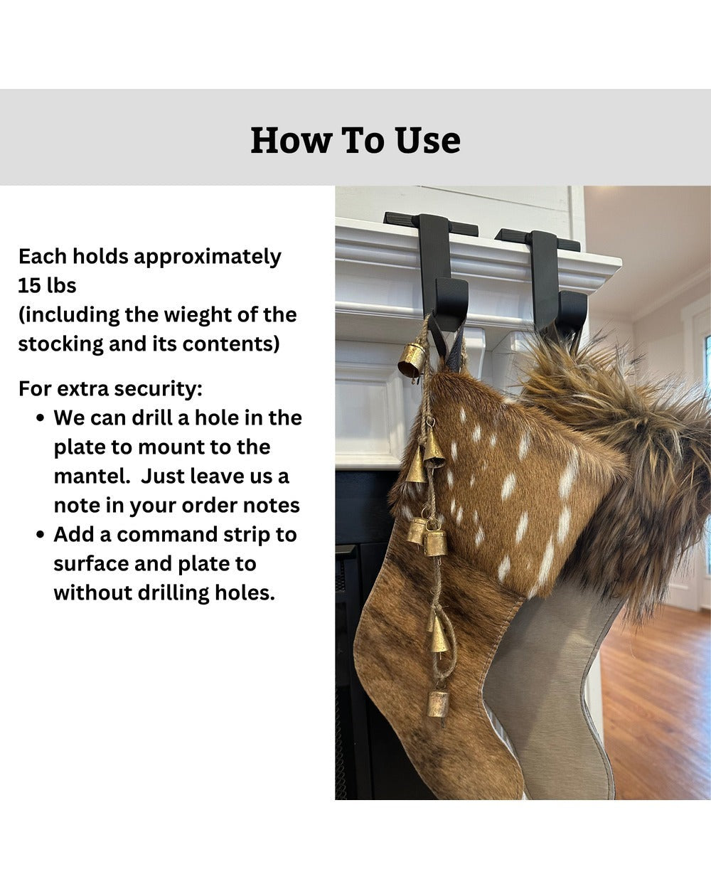 Add some functional elegance to your mantel with our Annie Stocking Holder, one of our most popular items. Each unit features a 1-inch wide hook welded onto a nearly 3lb free-standing steel plate to offer the ultimate support without the need to damage your mantel with screws. The hook’s simple look blends in seamlessly with Christmas decor, and its versatile, impermanent design makes it a great choice for styling, especially on counter tops and other hard surfaces where drilling would be a hassle.