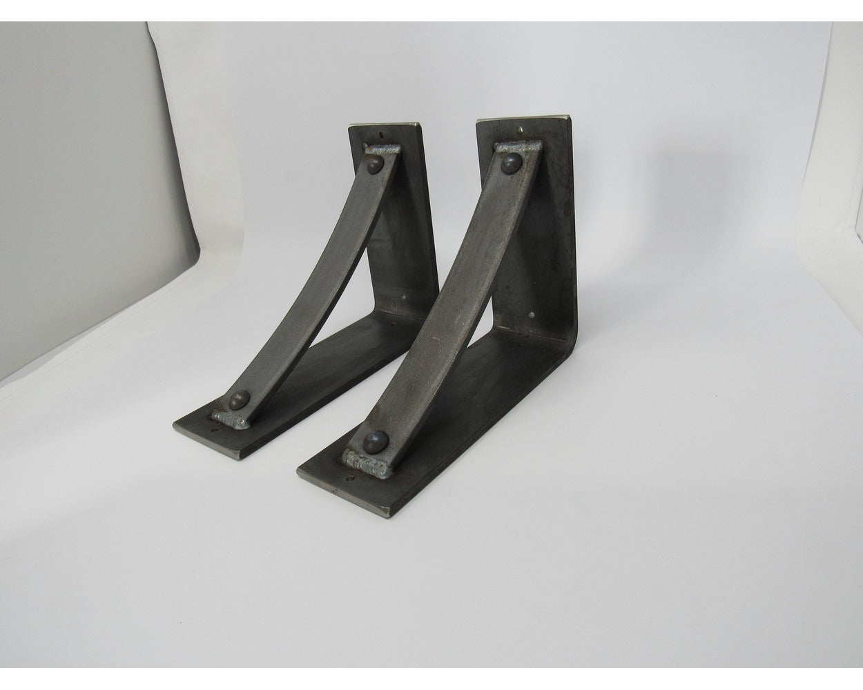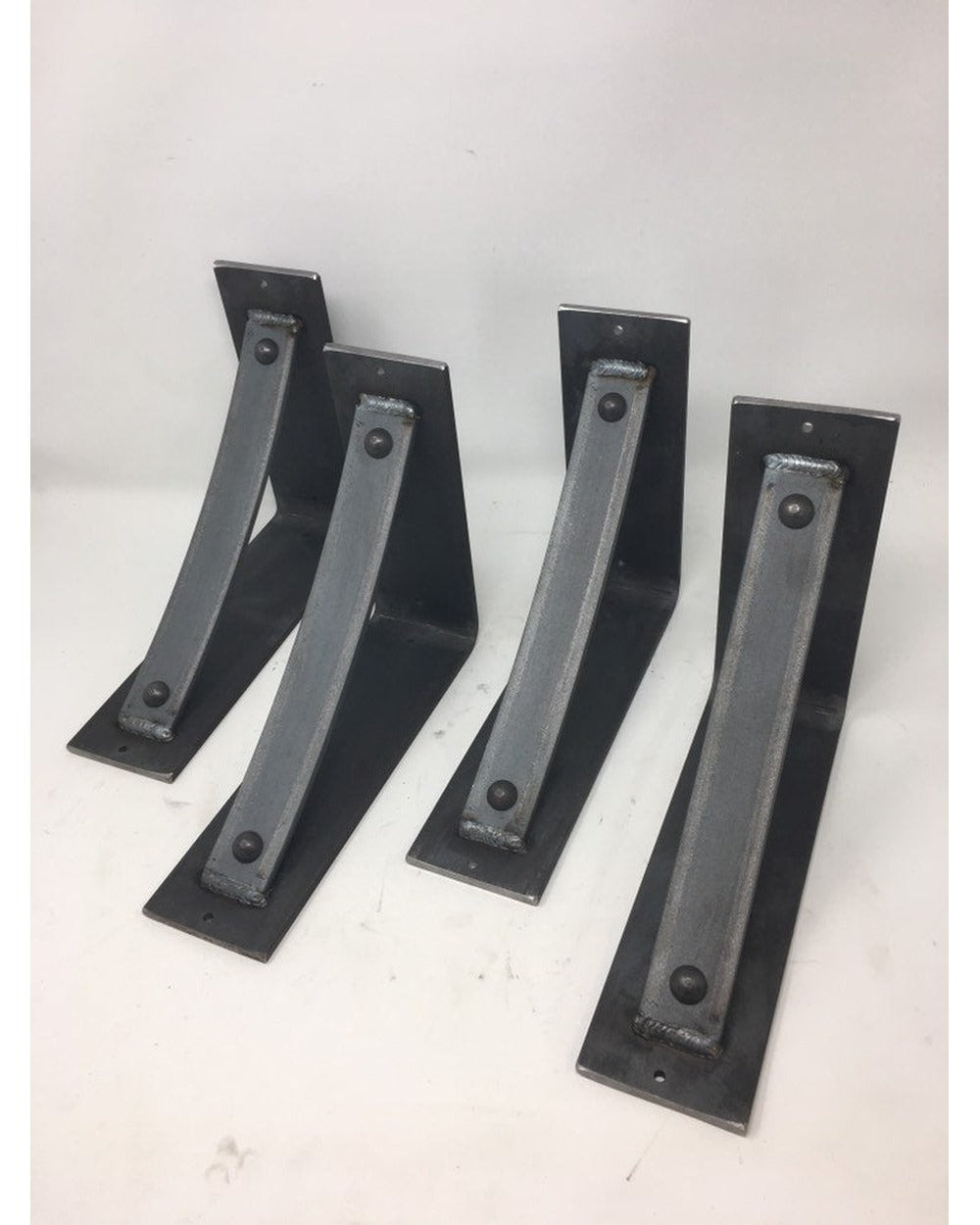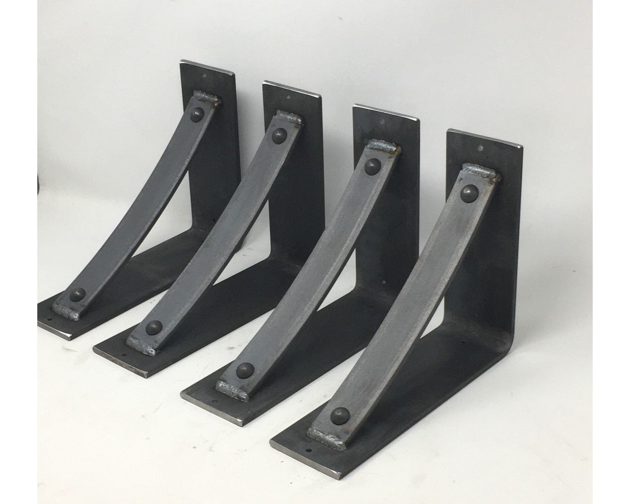 The Industrial Farm Co Troy Supports are a traditional "L" shaped bracket updated with a slightly curved support bar and decorative rivets. This design is 3 inches wide with a 1.5 inch curved support featuring rivets welded in at each end.