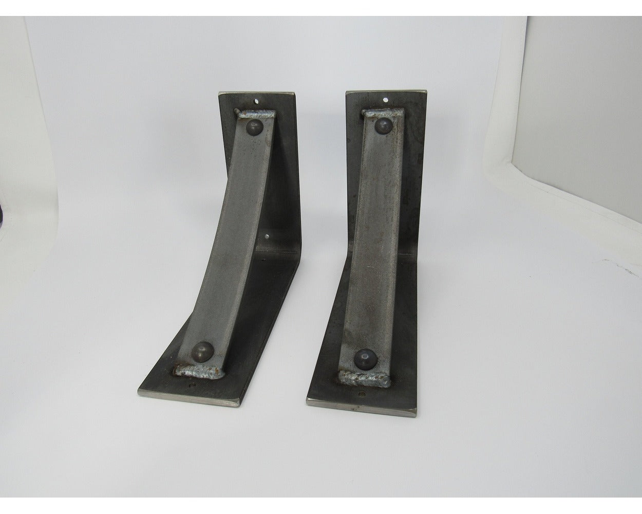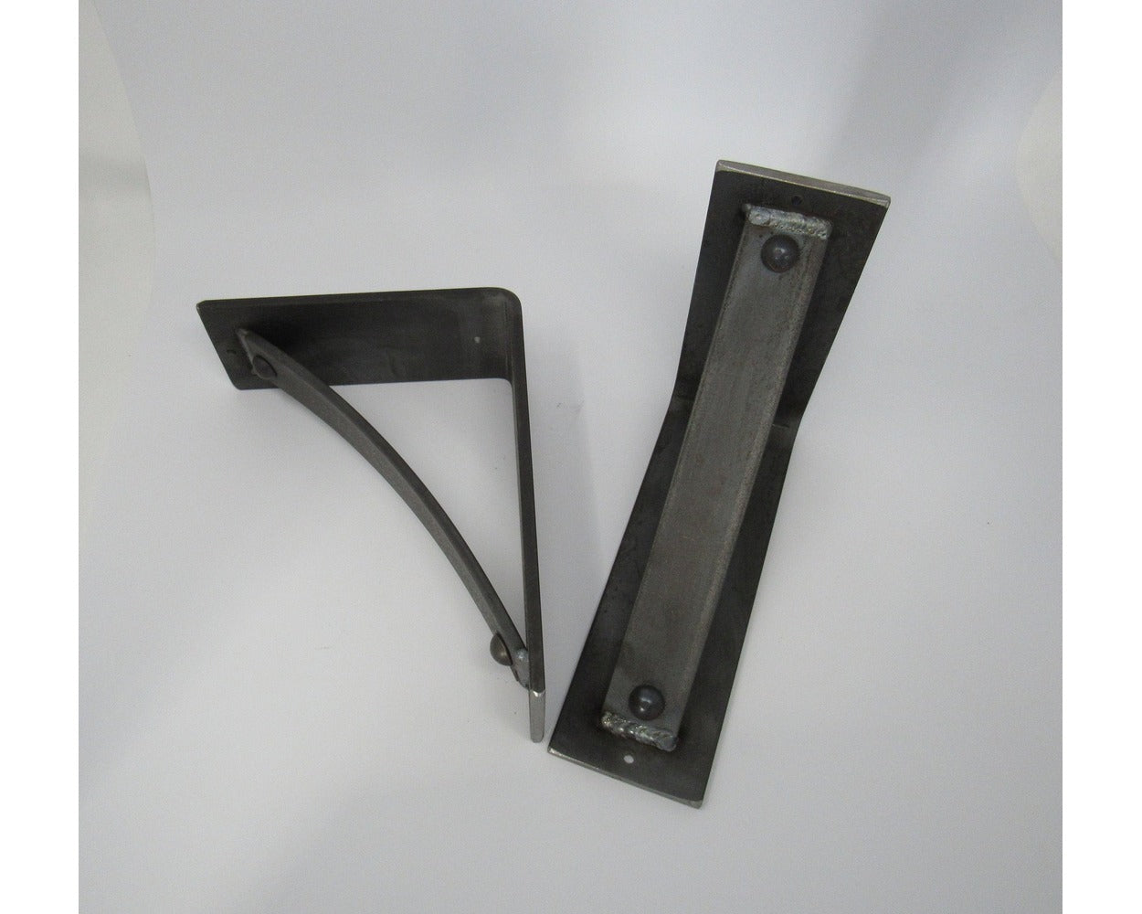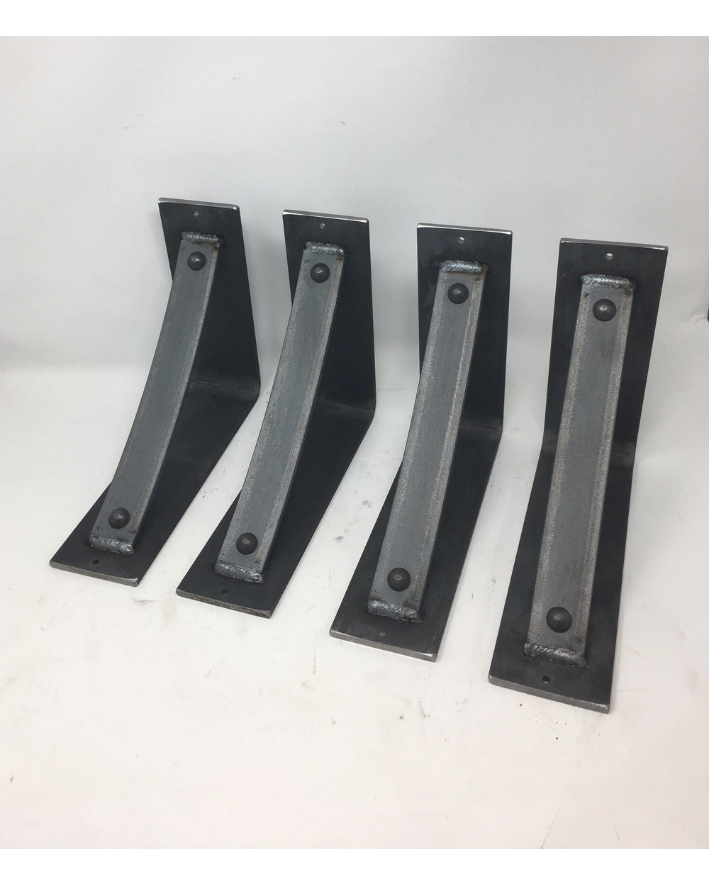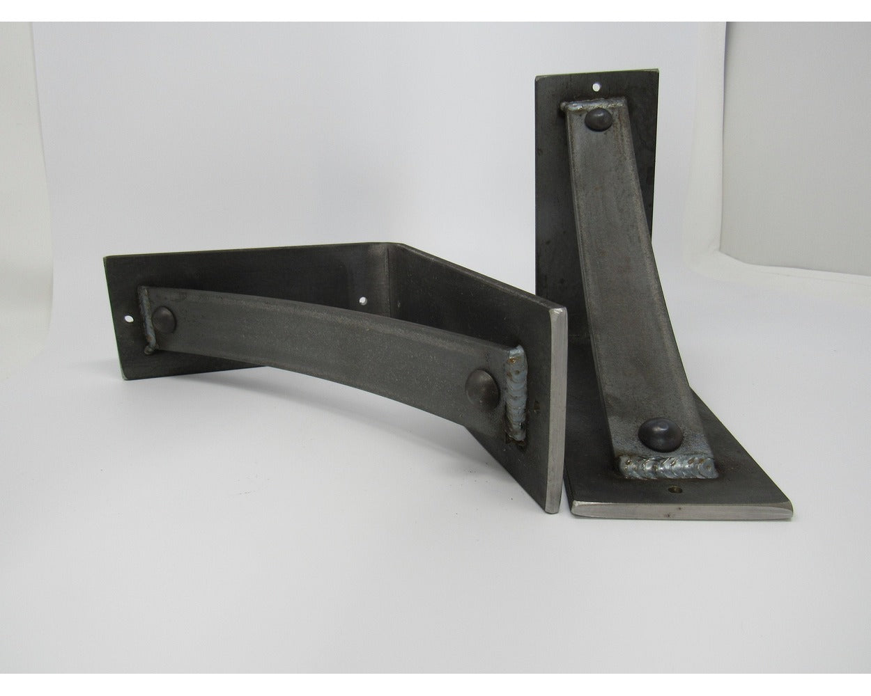 The Industrial Farm Co Troy Supports are a traditional "L" shaped bracket updated with a slightly curved support bar and decorative rivets. This design is 3 inches wide with a 1.5 inch curved support featuring rivets welded in at each end.